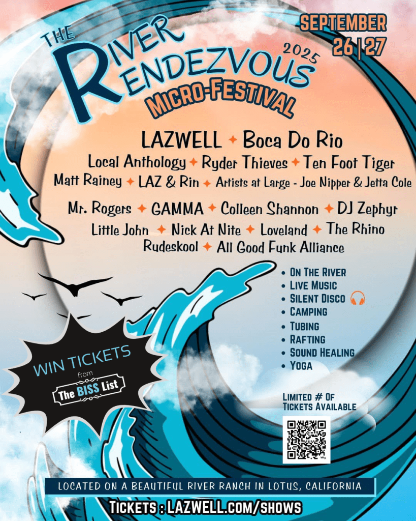 This micro festival is a one of a kind event! Get ready for a weekend of soul-soothing sights & sounds, high-vibe dancing, and river fun! Tucked away in the scenic beauty of a Private River Ranch in Lotus CA, this private gathering brings together an intimate crew for music, art , and community on the River. Lineup includes: LAZWELL, Boca Do Rio, Ten Foot Tiger, Ryder Thieves, Local Anthology, Matt Rainey & the Dipping Sauce, LAZ & RIN, DJ’s – Colleen Shannon – World’s sexiest DJ – 50th anniversary Playboy Playmate, All Good Funk Alliance, DJ Zephyr, Little John ( Raindance), Paul Gammah (Stilldream / Royal sound), Mr. Rogers, Loveland,Rudeskool, The Rhino, Nick at Nite.