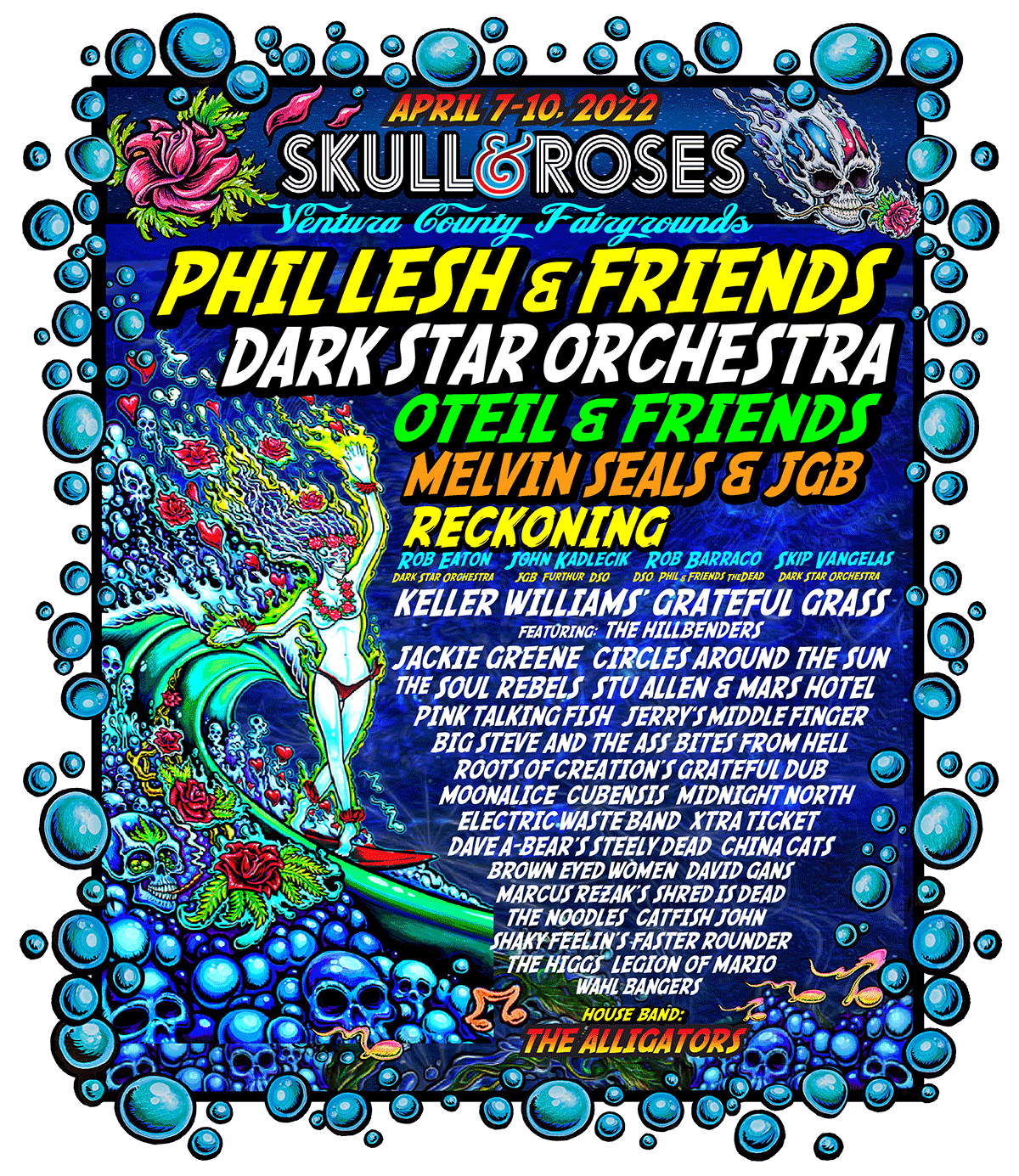 Featuring: Phil Lesh & Friends – Dark Star Orchestra – Oteil & Friends – Melvin Seals & JGB – Keller Williams’ Grateful Grass Feat: The Hillbenders – Jackie Greene – Circles Around The Sun – Stu Allen & Mars Hotel – Pink Talking Fish Are Dead – Big Steve And The Assbites From Hell – Jerry’s Middle Finger – Roots Of Creation’s Grateful Dub – Cubensis – Electric Waste Band – Xtra Ticket – The Warlocks Of Tokyo – Brown Eyed Women – Dave A-bear’s Steely Dead – David Gans – Marcus Rezak’s Shred Is Dead – China Cats – The Noodles – Catfish John – The Higgs – Legion Of Mario – Wahlbangers – House Band: The Alligators.