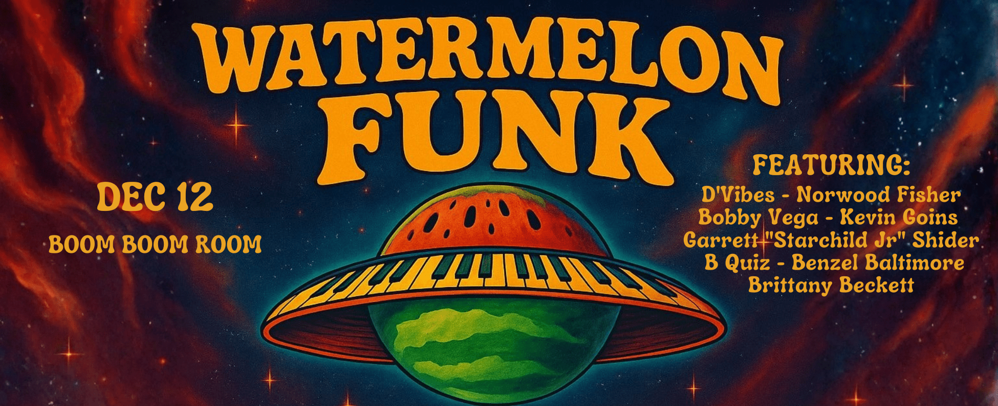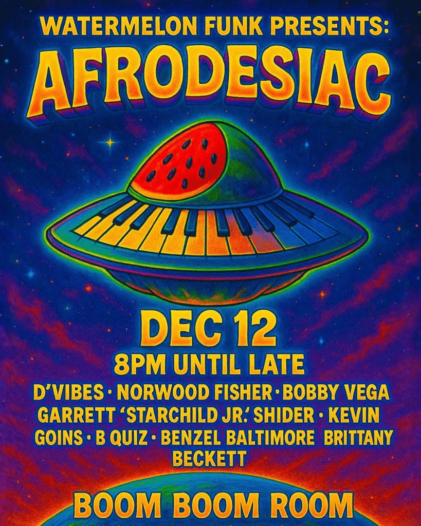 Watermelon Funk is a genre-defying collective led by Grammy-nominated musician and producer Deshawn “Dvibes” Alexander, keys player for Christone “Kingfish” Ingram. The band blends deep funk, soul, jazz, and hip-hop into an electrifying experience that moves both spirit and body. Featuring an all-star lineup of funk royalty and rising innovators: Starchild Jr. – (aka Garrett Shider), son of P-Funk legend Garry Shider, ~ Guitar and Vocals | Benzel Baltimore – (Benjamin Cowan), powerhouse drummer for George Clinton and P-Funk ~ Drums | Kevin Goins – brother of Glenn Goins and former frontman of Quazar and P-Theory, ~ Vocals | Norwood Fisher – Original member of Fishbone ~ Bass | Bobby Vega – Etta James ~ Bass | Brittney Beckett ~ Vocals | Bryce “B Quiz” Quinn ~ Guitar.